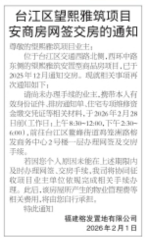 请尚未办理手续的业主,携带本人有效身份证件、排房通知单、住宅专项维修资金缴交凭证等相关材料,于2026年2月28日前(工作日:上午8:30~12:00,下午2:30~ 6:00),前往台江区鳌峰街道鸡笼洲路榕发商务中心2号楼一层办理网签及交房手续。