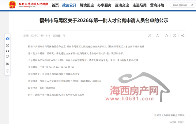 海西房产网(微信公众号:fjhxfcw)消息:1月29日,马尾区人力资源和社会保障局发布“福州市马尾区关于2026年第一批人才公寓申请人员名单的公示”。