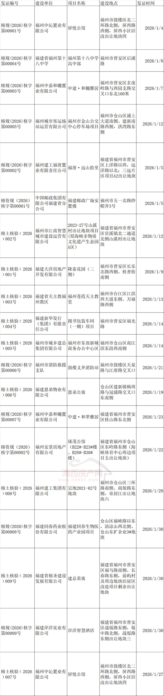海西房产网(微信公众号:fjhxfcw)消息:2025年2月1日,福州市自然资源和规划局公布“2026年1月份建设项目竣工条件核实结果发放情况”。