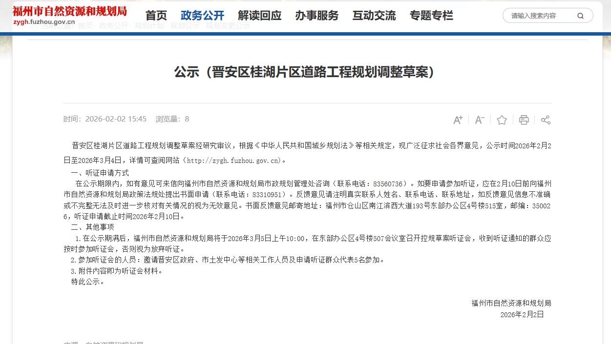晋安区桂湖片区道路工程规划调整草案经研究审议,根据《中华人民共和国城乡规划法》等相关规定,现广泛征求社会各界意见,公示时间2026年2月2日至2026年3月4日。