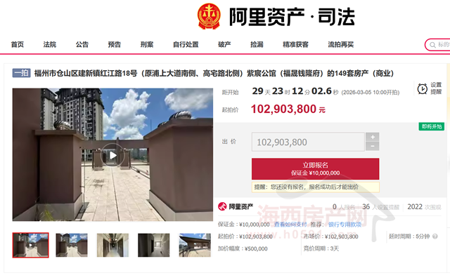 海西房产网(微信公众号:fjhxfcw)消息:上海金融法院将于2026年3月5日10时至2026年3月8日10时止(延时除外)在“淘宝网”上公开进行网络司法拍卖活动。