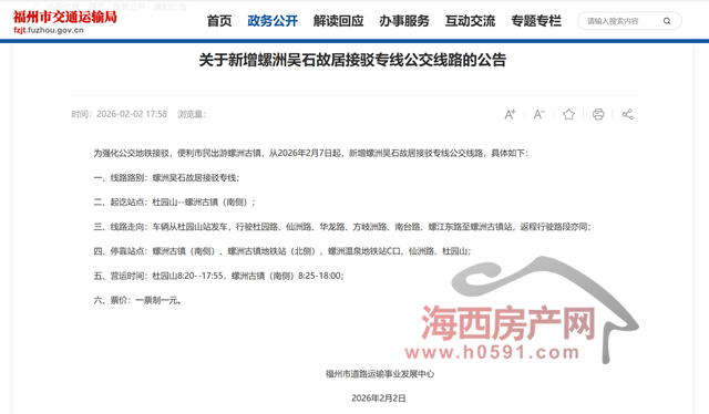 海西房产网(微信公众号:fjhxfcw)消息:2月2日, 福州市道路运输事业发展中心发布“关于新增螺洲吴石故居接驳专线公交线路的公告”。