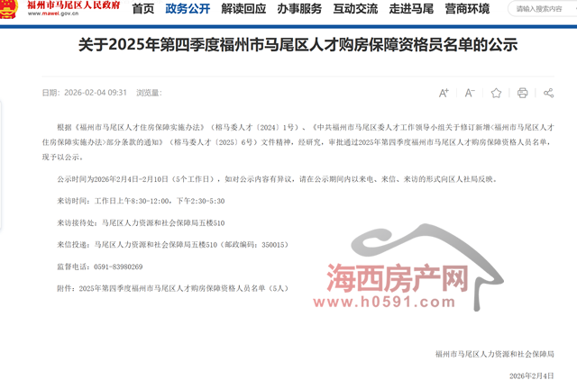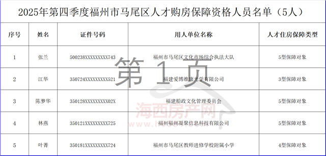 海西房产网(微信公众号:fjhxfcw)消息:2月4日,福州市马尾区人力资源和社会保障局发布“关于2025年第四季度福州市马尾区人才购房保障资格员名单的公示”。