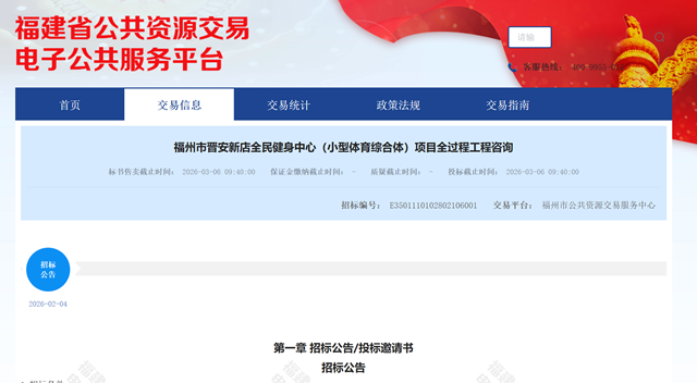 海西房产网(微信公众号:fjhxfcw)消息:2月4日,福建省公共资源交易电子公共服务平台发布“福州市晋安新店全民健身中心(小型体育综合体)项目全过程工程咨询招标公告”。