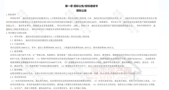 招标公告显示,福州市晋安新店全民健身中心(小型体育综合体)项目全过程工程咨询招标已经获批,项目业主为福州市晋安区国有资产投资发展集团有限公司,现对该项目的工程建设全过程咨询服务进行公开招标。