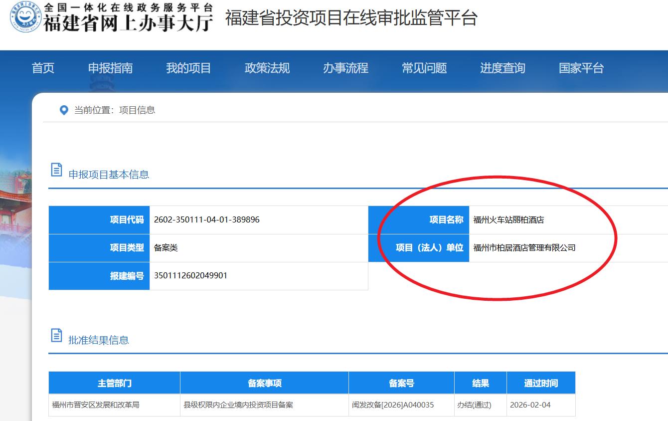 海西房产网(微信公众号:fjhxfcw)消息:福建省投资项目在线审批监管平台发布信息显示,“福州火车站丽柏酒店”已于2026年2月4日取得县级权限内企业境内投资项目备案,批准结果信息为办结(通过)。
