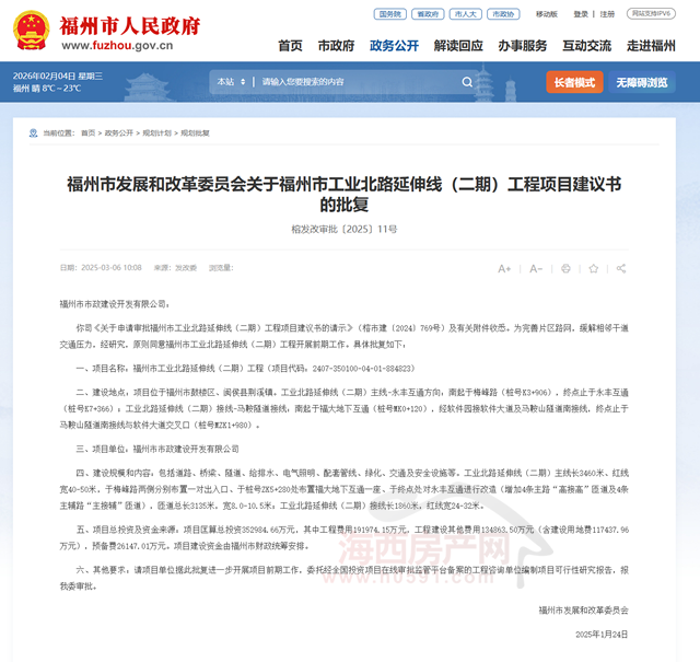 2025年3月6日,福州市发展和改革委员会发布“关于福州市工业北路延伸线(二期)工程项目建议书的批复(榕发改审批〔2025〕11号)”。