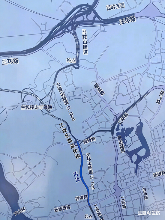 工业北路延伸线(二期)主线-永丰互通方向:南起于梅峰路(桩号K3+906),终点止于永丰互通(桩号K7+366);