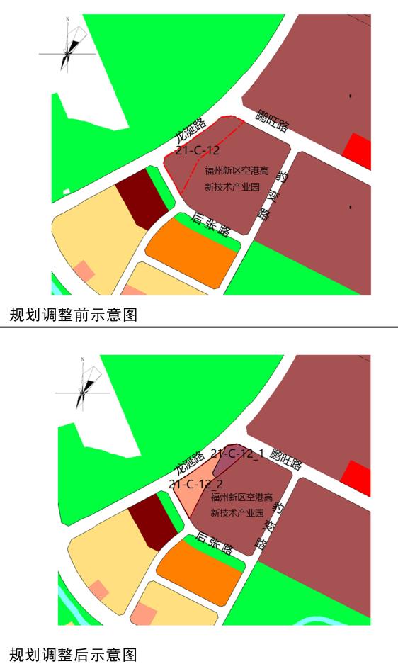 1.用地调整。根据湖南镇提供模拟方案,复核调整后规划指标,将21-C-12地块拆分为21-C-12_1、 21-C-12_2两个地块,其中21-C-12_1地块用地性质由二类工业用地(M2)调整为宗教用地(1503/A9),21-C-12_2地块用地性质由二类工业用地(M2)调整为文化用地(0803/A3)。