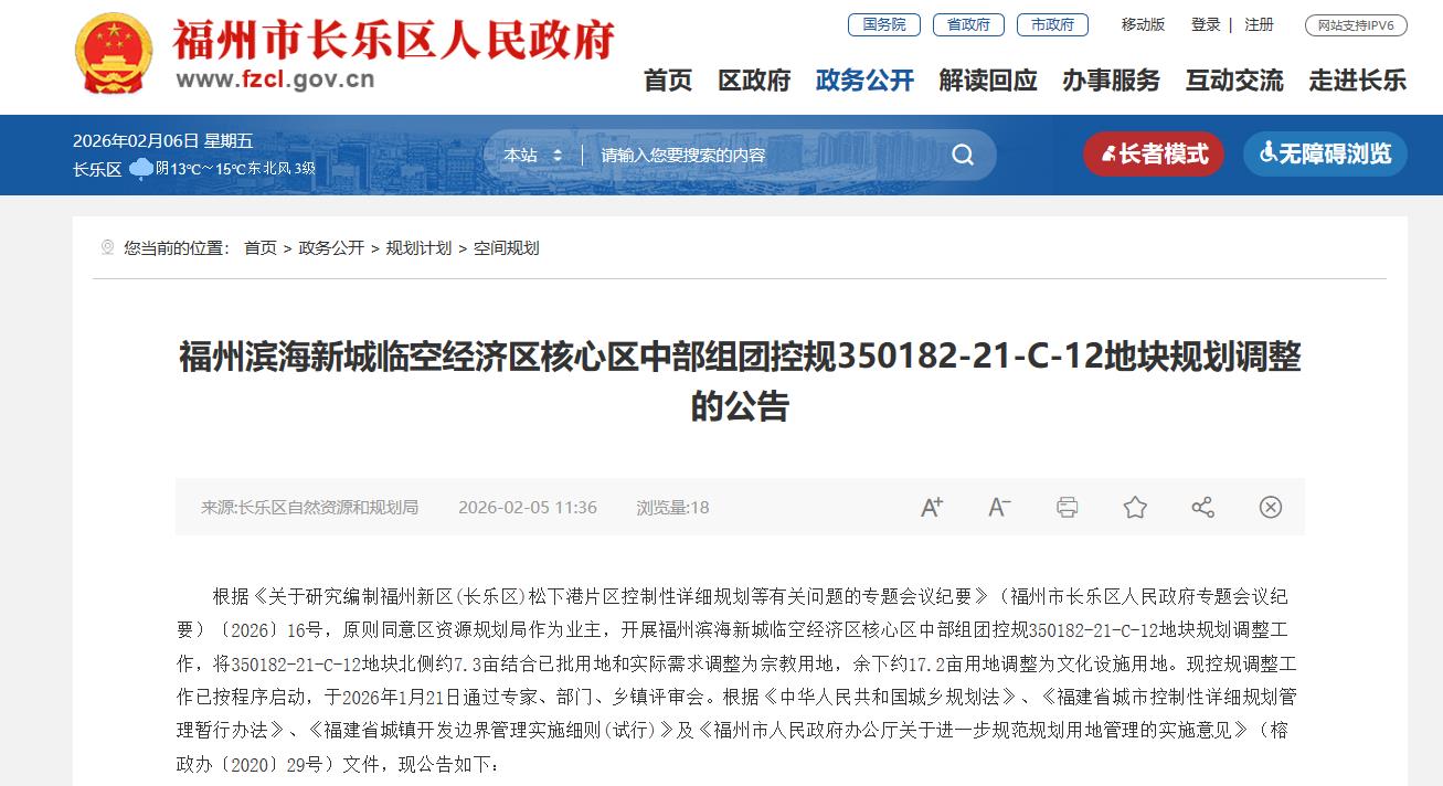 2026年2月5日,福州市长乐区自然资源和规划局发布“福州滨海新城临空经济区核心区中部组团控规350182-21-C-12地块规划调整的公告 ”。