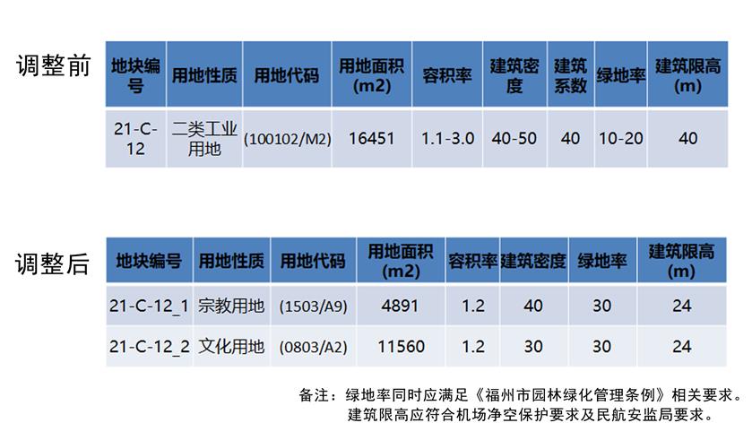 2、指标调整。21-C-12_1地块,宗教用地(1503/A9),用地面积4891平方米,容积率≤1.2,建筑密度≤40%,绿地率≥30%,建筑限高24米; 21-C-12_2地块,文化用地(0803/A2),用地面积11560平方米,容积率≤1.2,建筑密度≤30%,绿地率≥30%,建筑限高24米;绿地率同时应满足《福州市园林绿化管理条例》及省市关于绿地率控制的相关要求,建筑限高应符合机场净空保护要求及民航安监局要求。