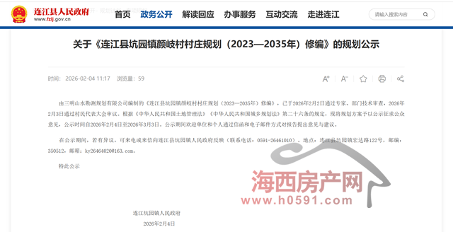 海西房产网(微信公众号:fjhxfcw)消息:2月4日,连江坑园镇人民政府 发布“关于《连江县坑园镇颜岐村村庄规划(2023—2035年)修编》的规划公示”。