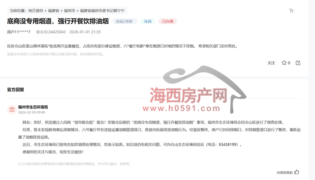 该投诉于2026年2月9日得到福州市生态环境局回复: