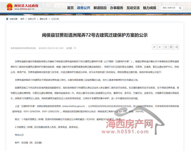 海西房产网(微信公众号:fjhxfcw)消息:2月6日,闽侯县自然资源和规划局发布“闽侯县甘蔗街道洲尾弄72号古建筑迁建保护方案的公示”。