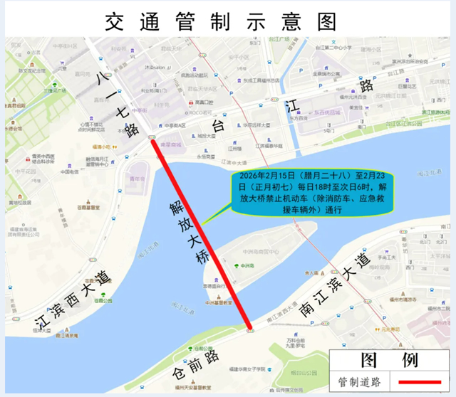 2026年2月15日(腊月二十八)至2月23日(正月初七)每日18时至次日6时,解放大桥禁止机动车(除消防车、应急救援车辆外)通行。