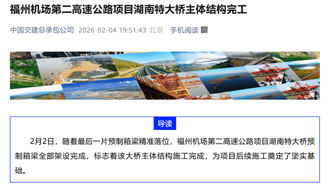 海西房产网(微信公众号:fjhxfcw)消息:中交二公局一公司对外透露,2月2日,随着最后一片预制箱梁精准落位,福州机场第二高速公路项目湖南特大桥预制箱梁全部架设完成,标志着该大桥主体结构施工完成,为项目后续施工奠定了坚实基础。