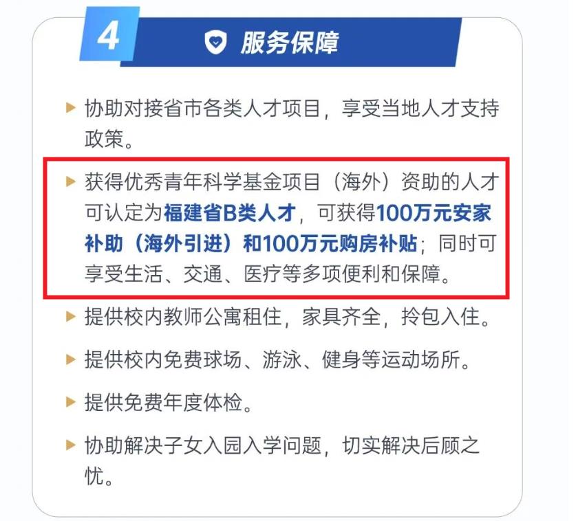 待遇方面,提供有国际竞争力的薪酬和福利待遇,具体根据人才情况"一人一议”。并提供科研经费、优质办公条件等各种支持。获得优秀青年科学基金项目(海外)资助的人才可认定为福建省B类人才,可获得100万元安家补助(海外引进)和100万元购房补贴;同时可享受生活、交通、医疗等多项便利和保障。