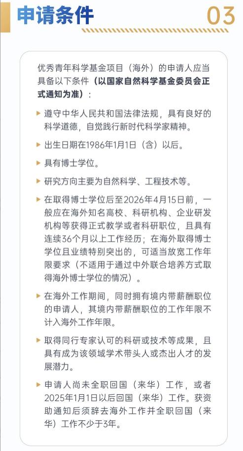 取得同行专家认可的科研或技术等成果,且具有成为该领域学术带头人或杰出人才的发展潜力。申请人尚未全职回国(来华)工作,或者2025年1月1日以后回国(来华)工作。获资助通知后须辞去海外工作并全职回国(来华)工作不少于3年。