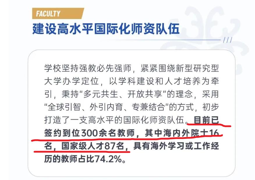 该校目前已签约到位300余名教师,其中海内外院士16名,国家级人才87名,具有海外学习或工作经历的教师占比74.2%。