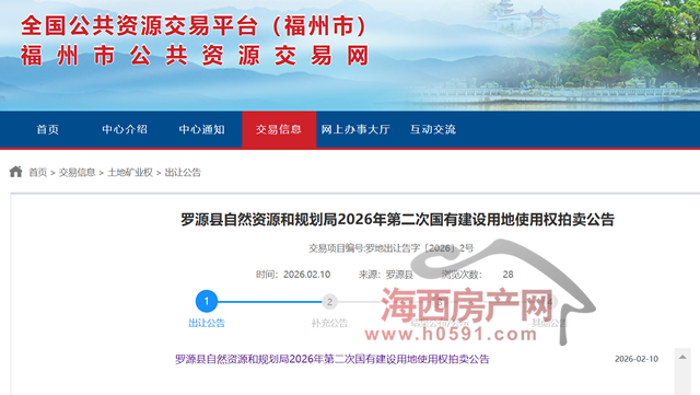 海西房产网(微信公众号:fjhxfcw)消息:2月10日,罗源县自然资源和规划局发布“2026年第二次国有建设用地使用权拍卖公告”。