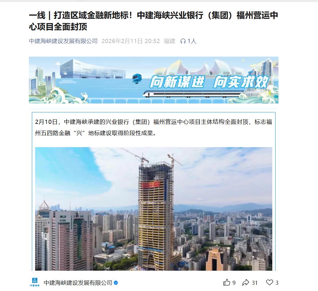 海西房产网(微信公众号:fjhxfcw)消息:据中建海峡建设发展有限公司报道,2月10日,该公司承建的兴业银行(集团)福州营运中心项目主体结构全面封顶,标志福州五四路金融“兴”地标建设取得阶段性成果。