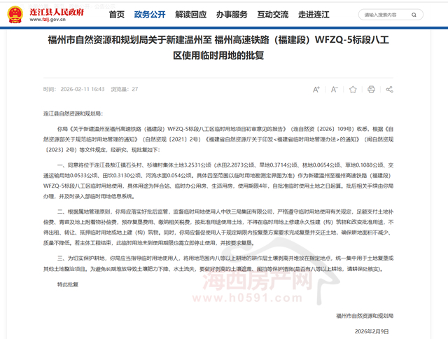 海西房产网(微信公众号:fjhxfcw)消息:2月11日,福州市自然资源和规划局发布“关于新建温州至 福州高速铁路(福建段)WFZQ-5标段八工区使用临时用地的批复”。