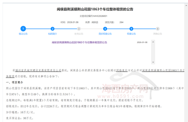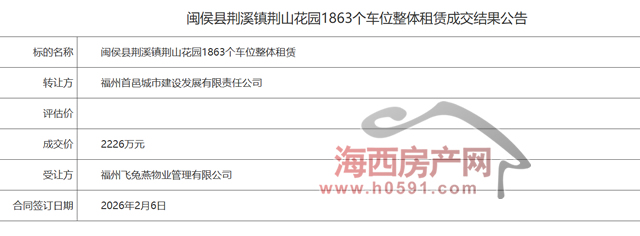 公告显示,福州飞兔燕物业管理有限公司以底价2226万元竞得闽侯县荆溪镇荆山花园1863个车位12年经营权。