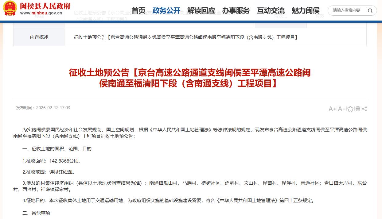 2026年2月11日,闽侯县人民政府发布“征收土地预公告【京台高速公路通道支线闽侯至平潭高速公路闽侯南通至福清阳下段(含南通支线)工程项目】”。