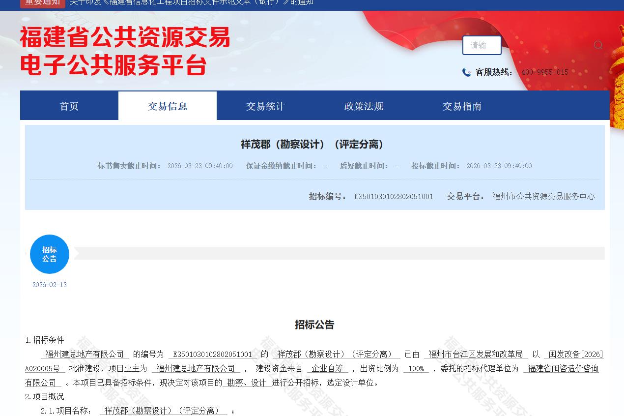 海西房产网(微信公众号:fjhxfcw)消息:2026年2月13日,福州市公共资源交易服务中心发布“祥茂郡(勘察设计)(评定分离)”。