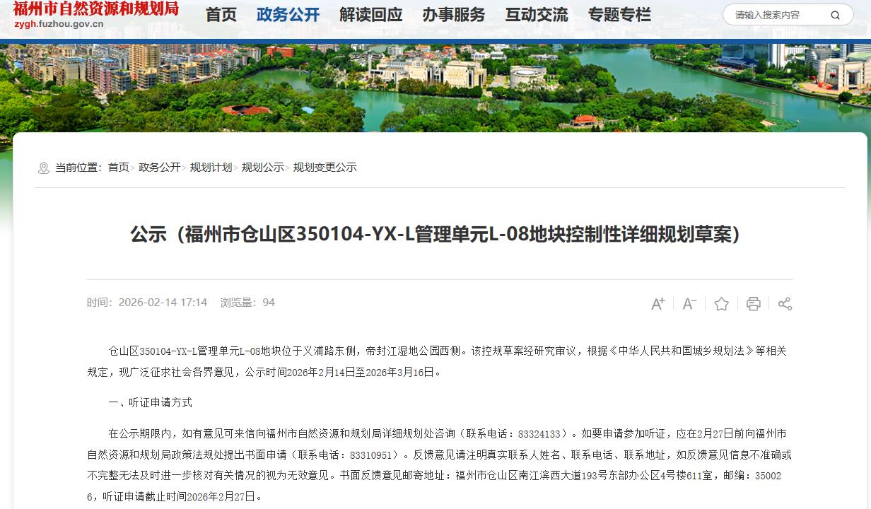 仓山区350104-YX-L管理单元L-08地块位于义浦路东侧,帝封江湿地公园西侧。该控规草案经研究审议,根据《中华人民共和国城乡规划法》等相关规定,现广泛征求社会各界意见,公示时间2026年2月14日至2026年3月16日。