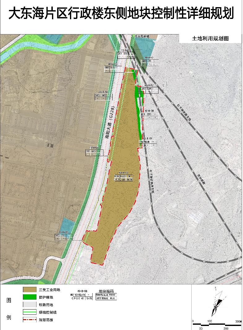规划地块主导功能主要为三类工业用地(M3/100103),用地面积约176927平方米;松下港区疏港支线铁路从地块东北角过境,沿铁路西侧布局防护绿地(G2/1402),面积约11725平方米。