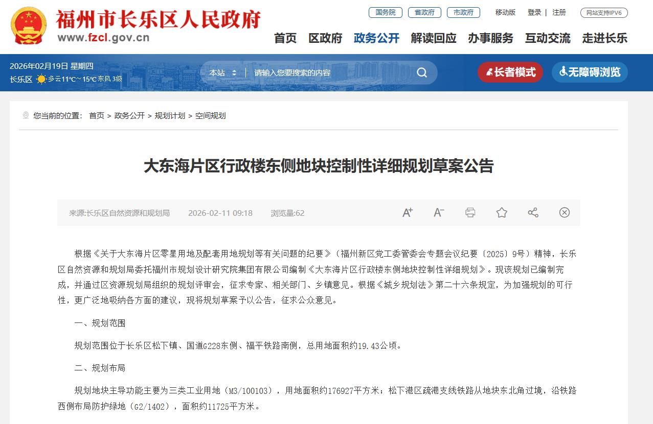 2026年2月11日,福州市长乐区自然资源和规划局发布“大东海片区行政楼东侧地块控制性详细规划草案公告 ”。