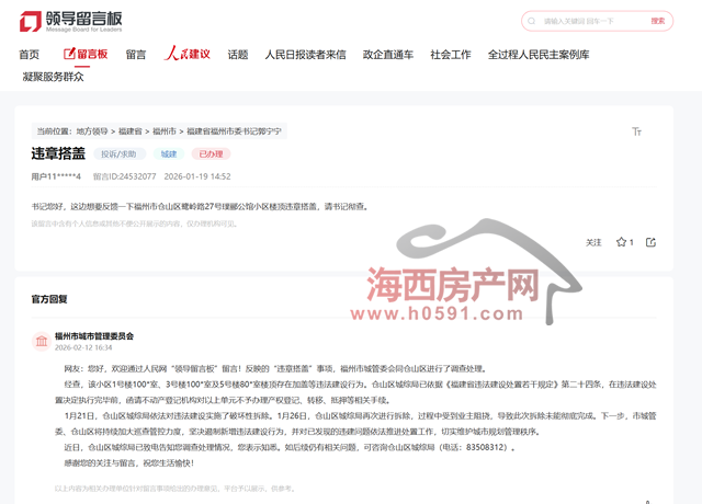 海西房产网(微信公众号:fjhxfcw)消息:近日,有网友通过人民网领导留言板投诉。福州市仓山区鹭岭路27号璞郦公馆小区(本网注:龙湖迪鑫九里晴川)楼顶违章搭盖。