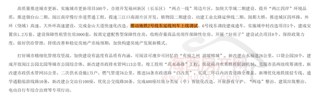 2026年福州政府工作报告明确,今年推动地铁2号线东延线列车上线调试、6号线东调段建成通车。