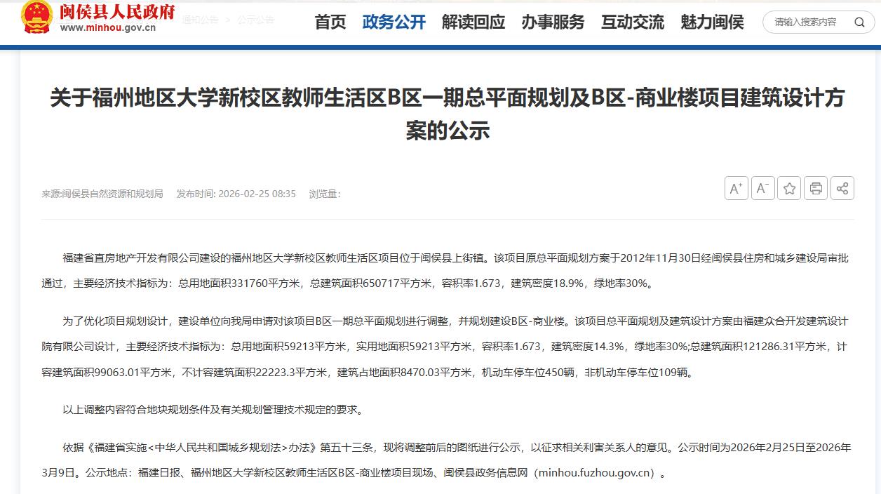 海西房产网(微信公众号:fjhxfcw)消息:2026年2月25日,闽侯县自然资源和规划局发布“关于福州地区大学新校区教师生活区B区一期总平面规划及B区-商业楼项目建筑设计方案的公示”。