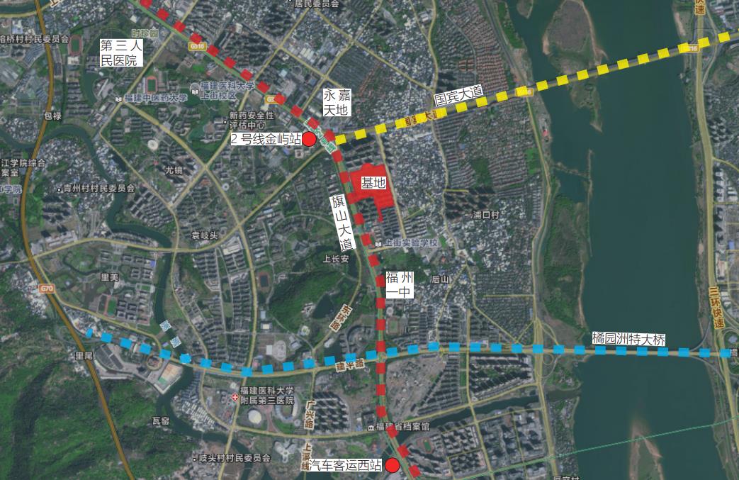 基地西邻旗山大道,北邻国宾大道,南邻橘园洲大桥,邻近地铁2号线金屿站和福州大学站,距离客运西站只有2公里路程,交通非常便利基地周边服务设施相对完善,涵盖教育、通讯、生活各方面。