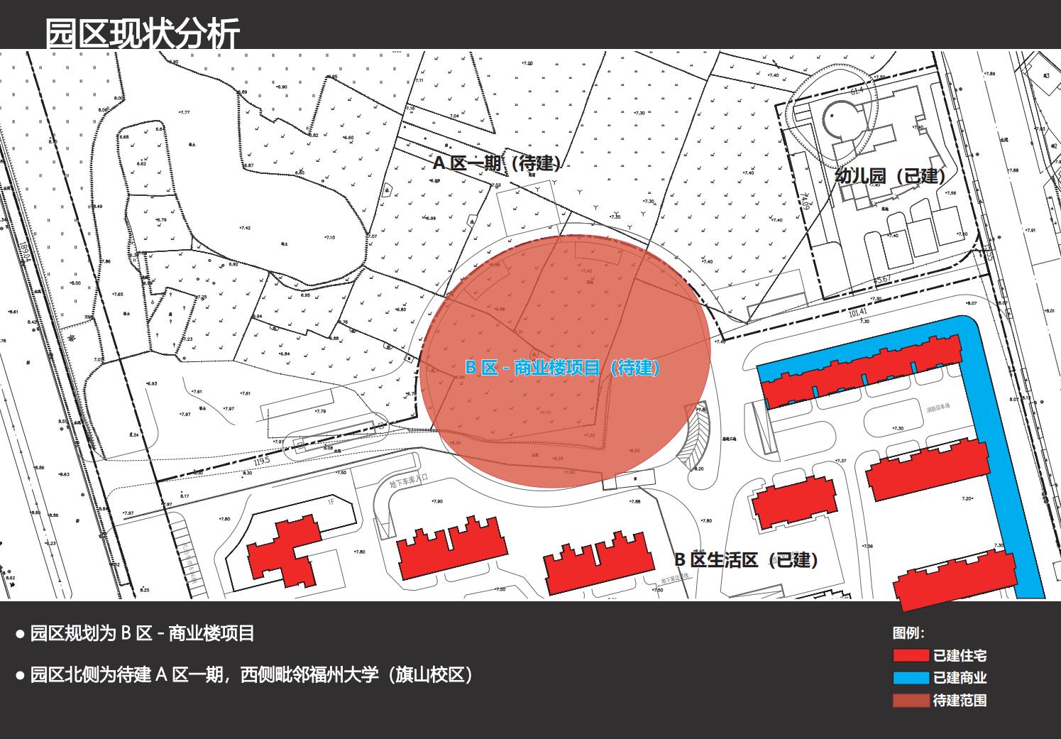 B区-商业楼项目工程建设地点位于福州市闽侯县,福州大学东北侧,西临旗山大道,东侧为农民拆迁安置用地,南面为福州地区大学新校区教师生活区项目B区,北面为博仕后家园B区。