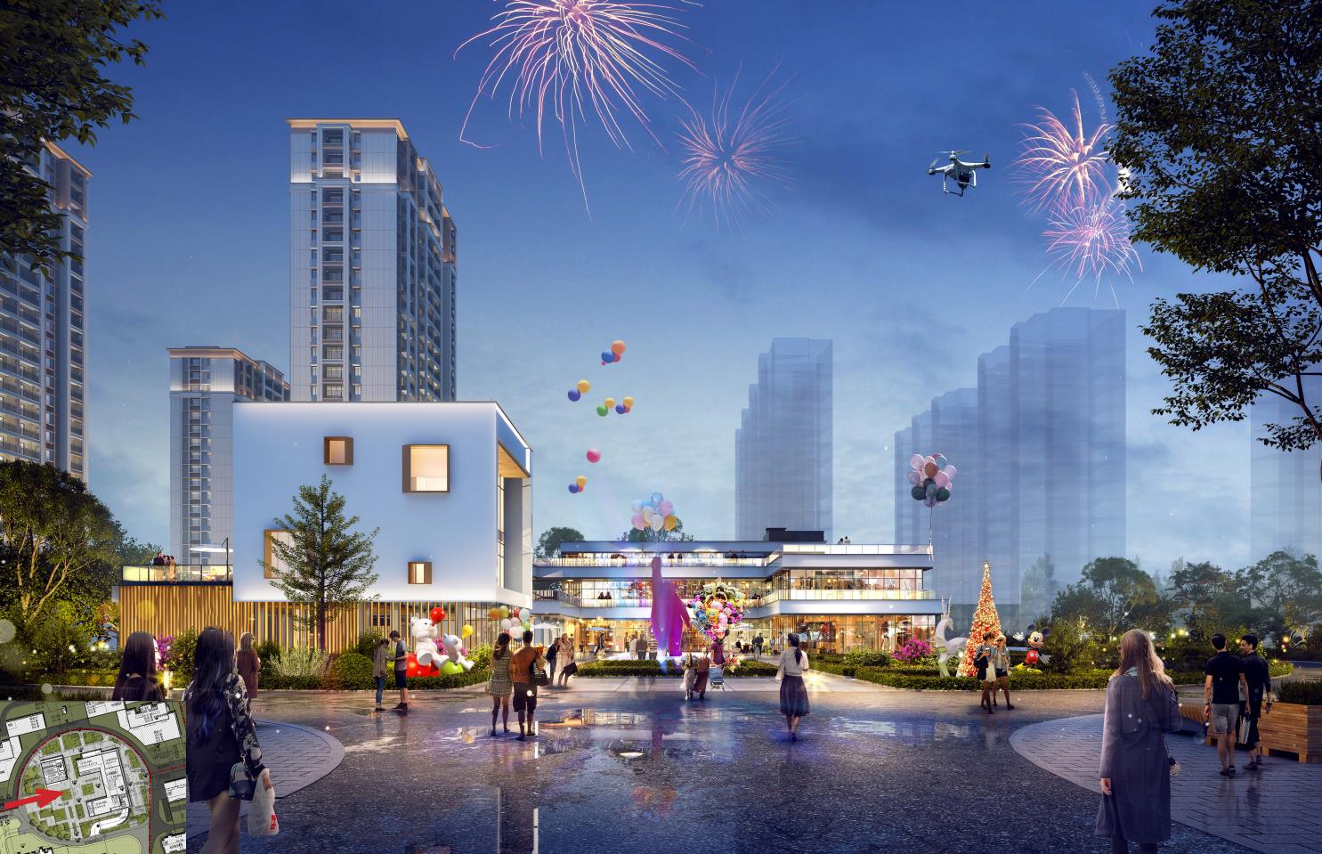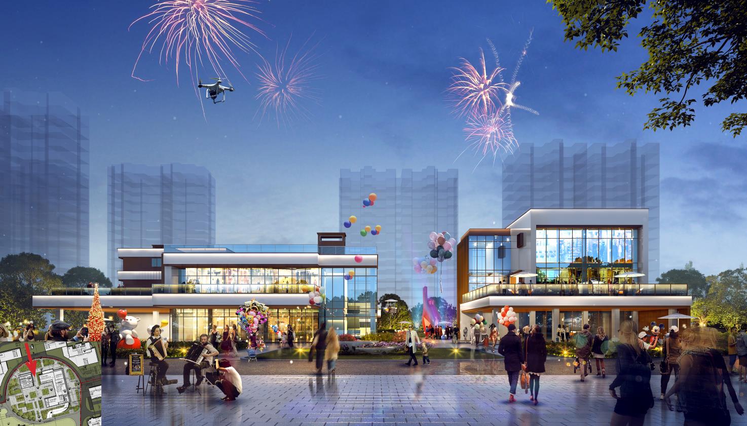 建筑体块在地块中散落、堆叠,形成大量灰空间及露台空间,共同塑造错落有致、轻松灵动的建筑形象及商业氛围。