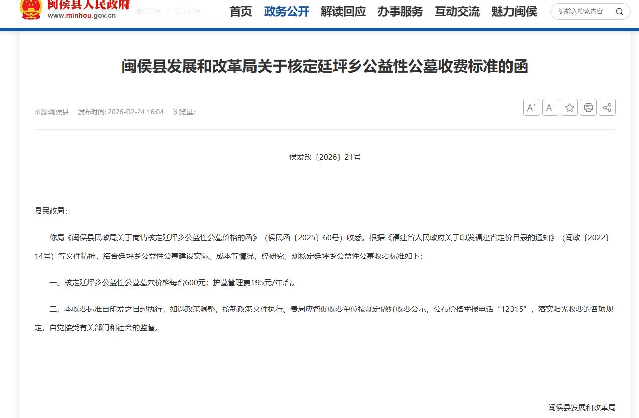 由闽侯县民政局《闽侯县民政局关于商请核定廷坪乡公益性公墓价格的函》(侯民函〔2025〕60号)收悉。根据《福建省人民政府关于印发福建省定价目录的通知》(闽政〔2022〕14号)等文件精神,结合廷坪乡公益性公墓建设实际、成本等情况,经研究,现核定廷坪乡公益性公墓收费标准如下: