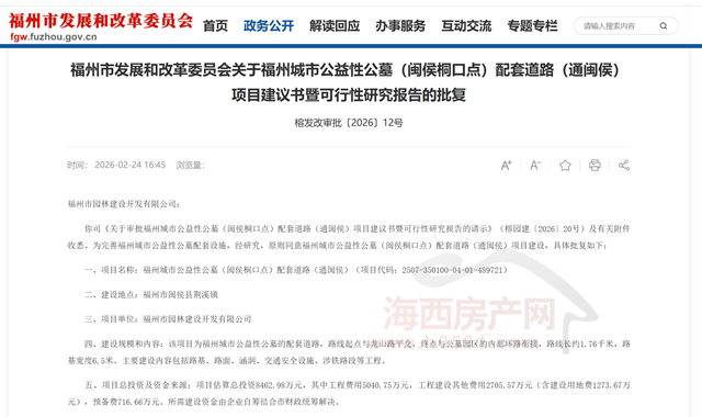 海西房产网(微信公众号:fjhxfcw)消息:2月24日,福州市发展和改革委员会发布“关于福州城市公益性公墓(闽侯桐口点)配套道路(通闽侯)项目建议书暨可行性研究报告的批复”。