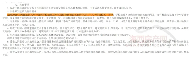 宗地2023-35号配建的九年一贯制学校建成后产权无偿移仓山区教育局作为“十九中仓山校区”办学;学校建设方案应经仓山区教育局同意,交付标准为完成《中小学设计规范》涉及的建设内容和相关硬装施工,并完成地下室、运动场和体育馆相关设施施工,除教学、办公所需的仪器设备外,符合开办条件。