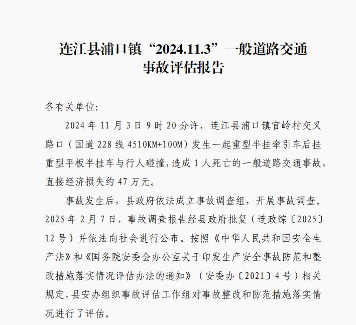 2024年11月3日9时20分许,连江县浦口镇官岭村交叉路口(国道228线4510KM+100M)发生一起重型半挂牵引车后挂重型平板半挂车与行人碰撞,造成1人死亡的一般道路交通事故,直接经济损失约47万元。