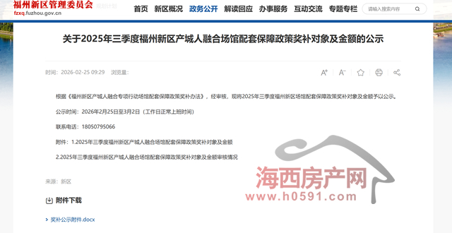 海西房产网(微信公众号:fjhxfcw)消息:2月25日,福州新区发布“关于2025年三季度福州新区产城人融合场馆配套保障政策奖补对象及金额的公示”。