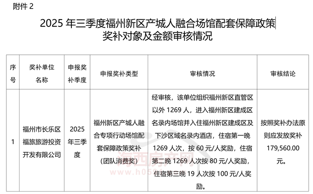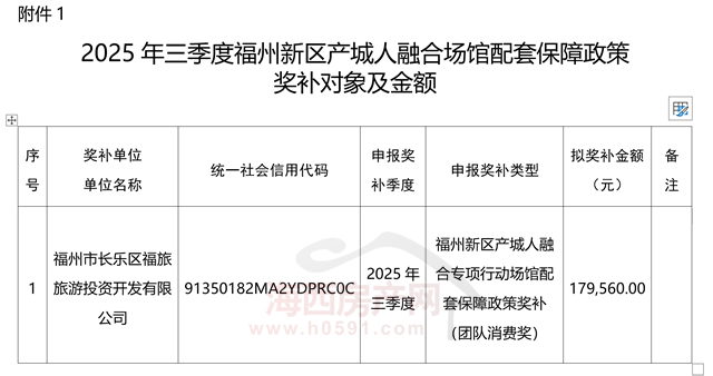 根据《福州新区产城人融合专项行动场馆配套保障政策奖补办法》,经审核,现将2025年三季度福州新区场馆配套保障政策奖补对象及金额予以公示。
