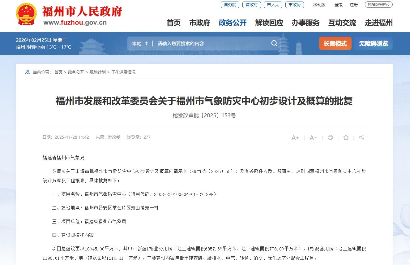 官方在该项目的批复显示,福州市气象防灾中心(项目代码:2408-350100-04-01-274398)建设地点位于福州市晋安区茶会片区鼓山镇鼓一村。