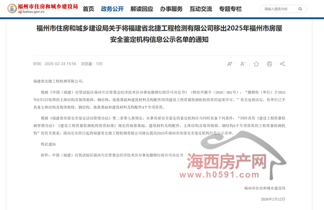 海西房产网(微信公众号:fjhxfcw)消息:2月24日,福州市住房和城乡建设局下发“关于将福建省北捷工程检测有限公司移出2025年福州市房屋安全鉴定机构信息公示名单的通知”。