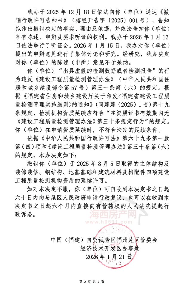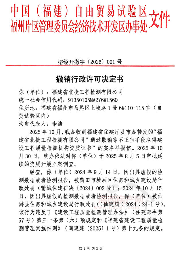 “通知”显示,根据《中国(福建)自贸试验区福州片区管委会经济技术区办事处撤销行政许可决定书》(榕经开撤字〔2026〕001号):“撤销福建省北捷工程检测有限公司于2025年8月5日取得的主体结构及装饰装修、钢结构、地基基础和建筑材料及构配件四项建设工程质量检测机构资质的延续许可。”
