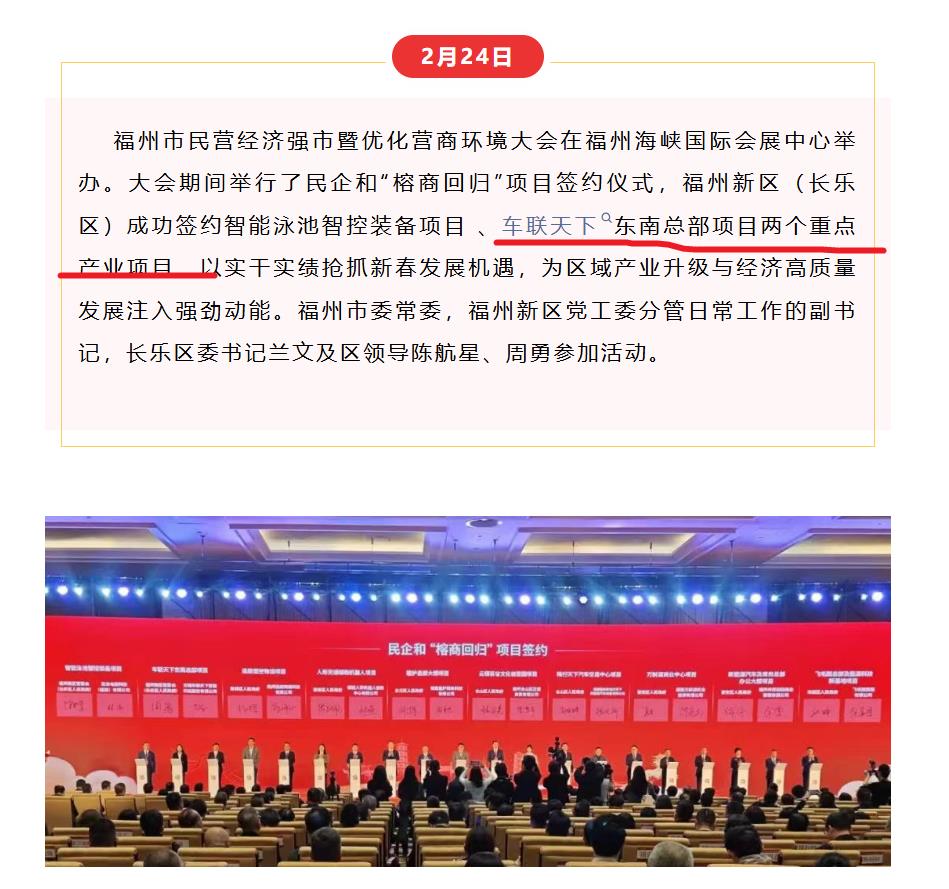 据长乐区融媒体中心报道,2026年2月24日,福州市民营经济强市暨优化营商环境大会在福州海峡国际会展中心举办。大会期间举行了民企和“榕商回归”项目签约仪式,福州新区(长乐区)成功签约智能泳池智控装备项目 、车联天下东南总部项目两个重点产业项目。