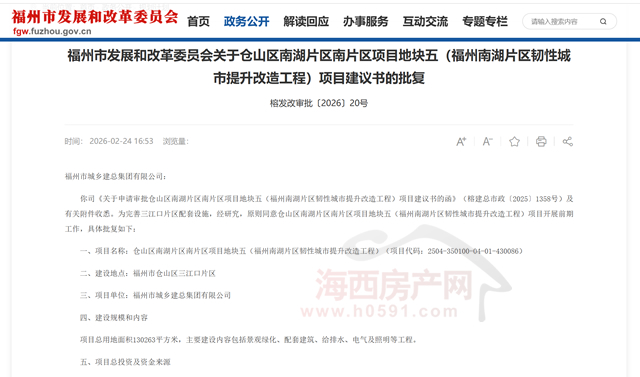 海西房产网(微信公众号:fjhxfcw)消息:2月24日,福州市发展和改革委员会发布“关于仓山区南湖片区南片区项目地块五(福州南湖片区韧性城市提升改造工程)项目建议书的批复(榕发改审批〔2026〕20号)”。