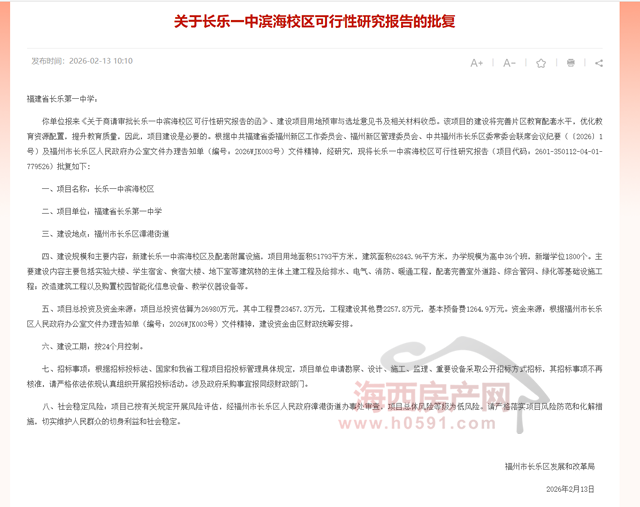 海西房产网(微信公众号:fjhxfcw)消息:近日,福州市长乐区发展和改革局发布“关于长乐一中滨海校区可行性研究报告的批复”。